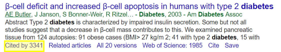 2) Beneath each result, you will see the number of times it has been cited by other articles in the Google Scholar database: